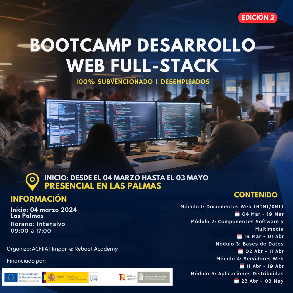 Nos complace anunciar el lanzamiento del nuevo programa de formación tecnológica de alto impacto impartido por Reboot Academy. Este itinerario de Desarrollo Web Full-Stack está diseñado específicamente para dotar de competencias digitales avanzadas a personas en situación de desempleo de larga duración, facilitando su reinserción laboral en uno de los sectores con mayor crecimiento de Canarias.